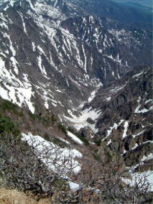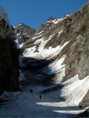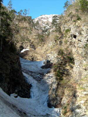 両岸のルンゼ(岩溝)から雪崩れた大きなデブリや雪渓上に散らばる大小さまざまの岩石に、本コースの厳しさが実感される。突然、先行者によって誘起された両拳大の落石が横を掠めていく。1100m付近で若干傾斜が緩み、振り返ると富良野・十勝連峰が残雪で輝いていた。