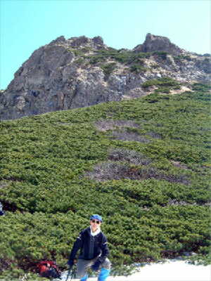 「ラァク(落)!ラァク(落)!」と後続の男性が叫ぶ。一稜を登攀中の人がいるらしい。忍耐の時間が過ぎ、やがて傾斜が緩むとそこは旧道コースから山頂に取りつくハイ松帯であった。9時37分ついに登り切った。