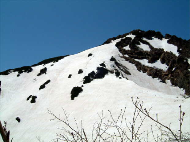 やがて雪渓は右に緩くカーブしながら一稜の裾に沿って左カーブし、稜線のお花畑に向かって40度を超える急斜面の直登になる。本コース最後の難関である。踏み外すと500mの滑落は避けられず致命的で、失敗は絶対に許されない。
