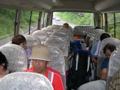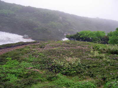 姿見の池から300mほど行った所でリーダ(多田)、および持田が足の不調でリタイヤ。リーダー代行を多田まさ子とし、中島、須川の3名が霧の中、頂上に向かった。