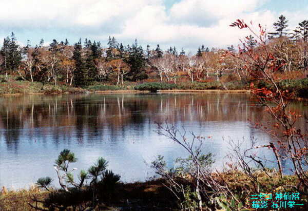 沼の周りは、ミズゴケ、モウセンゴケ等で覆われ、木道が巡らされている。水面に映
