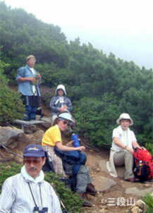 駐車場はすでに満杯状態。13時50分発。次々と下山してくる人たちとすれ違い、三段山コースへ左折。小さな沼を経て笹野原を進むと、尾根への急登である。