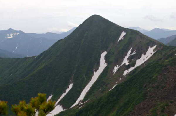 やがて、「トッタの泉」に着き、冷たい湧水で喉を潤して妻を待つ。再び喘ぎながら登り続けると、笹薮からハイ松との混合林帯に突入し視界も開けてくる。振り返ると、チロロ岳と西峰が並んで現れ、我々を激励してくれているかのようだ。前方には、ヌカビラ岳の岩塊も望まれ、傾斜も少しずつゆるくなる。