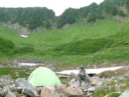 垂直に天を突くカール壁に囲まれた緑の原、小さな雪渓から流れる小川のせせらぎ、風の音、まさに天上の楽園である。でもここは熊の楽園でもある。1張りのテントがあり、外では一組の男女が夕食中であった。挨拶を交わし、我々も少し離れたガレ場にテントを張り、お湯を沸かして食事を済ませる。凍らしてきたビールは解けておらず今夜は飲むことができない。