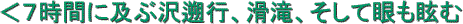 やがて滝が現れ、その上部の滑滝への期待が膨らむ。滝の下で一息入れた後、左岸の滑りやすい土壁に取り付く。慎重に登り続けると、やがて長さ300mの滑滝が20度ほどの急傾斜で現れた。