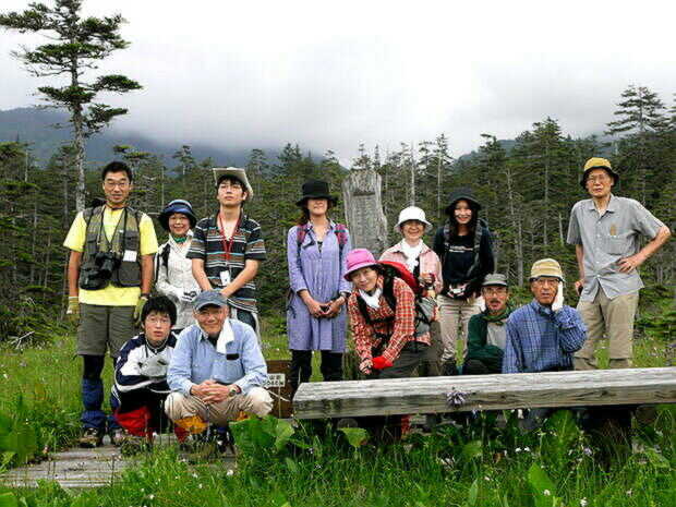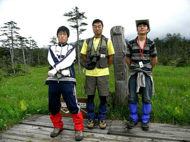 15時、バスで愛山渓温泉に到着。宿に荷物を置いて、雲井が原湿原散策に出かける。昨日の降雨はなかったようで道は乾いていた。15分程で到着した湿原は小規模だが、タチギボウシ、トキソウ、ワタスゲ、ホソバキソチドリなどの湿原性植物が満開。曇り模様だが、永山岳や愛別岳が迫力ある姿を見せ、山を背景に記念写真を撮って戻る。